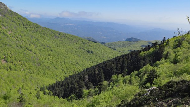 Les vistes son esplèndides davant nostre, i tenim una bona perspectiva de la ruta que hem fet fins ara. La baixada ens farà anar en compte amb les pedres. Retornem a la collada i agafem el PRC208 a la nostra esquerra, que fa una decidida baixada, dintre del bosc.