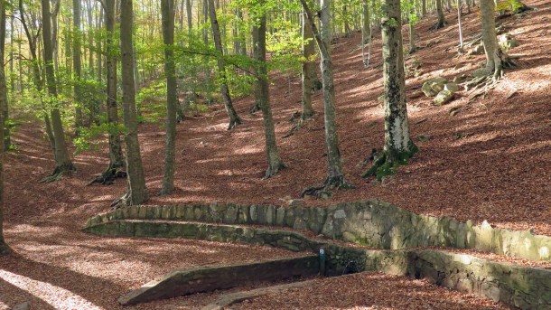 Seguim camí de baixada per la fageda, fins que arribem a una cruïlla de camins, on veurem una fita de pedres a la nostra dreta, i davant nostre una pal senyalitzador.