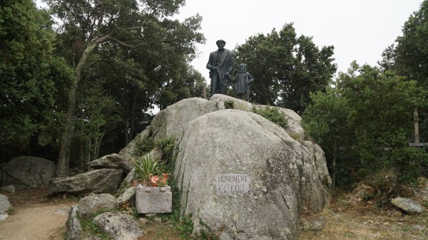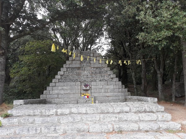 A la nostra dreta, trobem un monument commemoratiu de la passada per aquest lloc de membres dels govern de la República i la Generalitat, marxant cap a l´exili. Seguim rectes per una pista en suau baixada, camí del pobles de Las Illes. Es un trajecte molt agradable, pel mig del bosc. Enllacem amb una pista, i la seguim a la nostra dreta, i uns metres enllà, veurem una tanca. Al costat, surt un corriol, on veurem una marca groga, i l´agafem en baixada decidida. Cal anar una mica en compte. El terreny pot estar una mica humit.