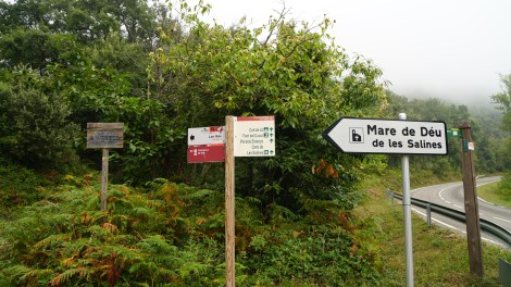 Just uns metres mes endavant de la casa, hi ha un pal senyalitzador d´Itinerannia, AE013. Recte amunt aniríem a les Salines, però hem d´agafar un corriol a la dreta, que uns metres enllà, passa per una tanca metàl·lica, i som amb un prat. Ara seríem en territori francès.