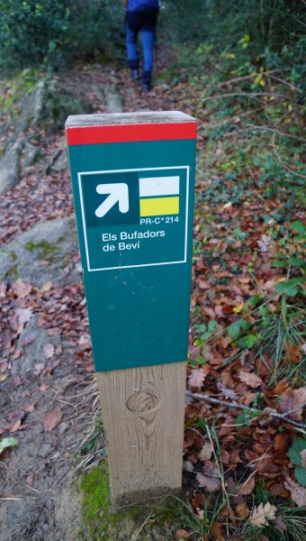 Trobem un corriol a la nostra dreta, on hi ha un senyal que posa Bufadors de Beví. El camí es complica des d´aquest moment, ja que anem per una zona molt a l´obaga. Veurem un senyal vermell en un arbre, i haurem de fer una petita pujada per un terreny relliscós( a la vora, podem trobar una drecera menys problemàtica).