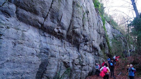 Trobem formacions rocoses, en una zona boscosa, amb molta fullaraca, i en pujada. Veurem marques taronges. Anem pel mig d´una fageda, fins que arribem a la part mes coneguda, on veurem una enorme paret de roca.