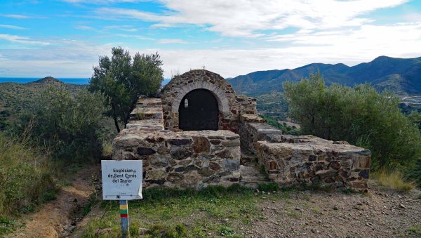 Un cop trobem el senyal, veurem uns metres avall la petita església. Deixem la pista, i agafem el corriol en baixada a la nostra esquerra. Tenim una bonica perspectiva de Llança, amb la façana marítima. Podem fer una aturada, abans de fer el camí de tornada, ja de baixada.