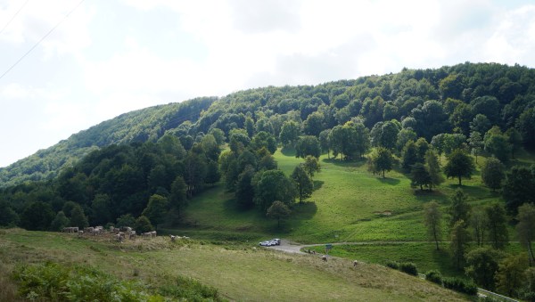 Arribem a un collet, on trobem arbres mes grans, la baixada es suavitza, per una fageda molt agradable, fins que sortim d´aquesta, creuem un prat, i entrem de nou al bosc, menys atapeït. El camí va alternant baixada i planer, fins arribar a una clariana al bosc, on trobem una cruïlla de camins.