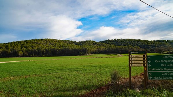 Fem camí de retorn fins la cruïlla amb el senyal MM2 i seguirem la pista cimentada avall, fins que en un revolt, deixem la carretera i seguim una pista de terra, seguint els senyals grocs (5,00 qm), fins que arribem a prop d´un mas, que sembla deshabitat.