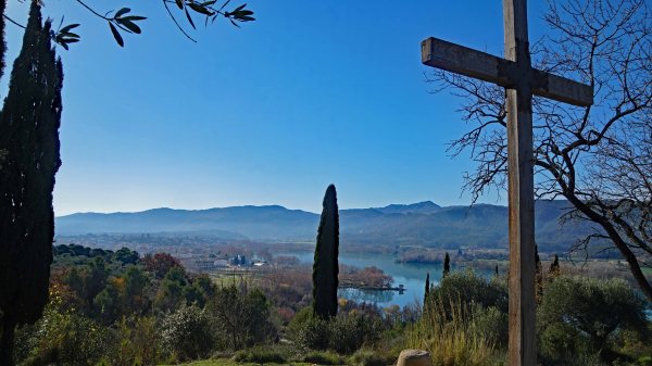 Veurem una gran creu, on tindrem vistes sobre l´estany. Al seu darrera, hi ha una esplanada on es conserva un petit rastre de l´antic convent.