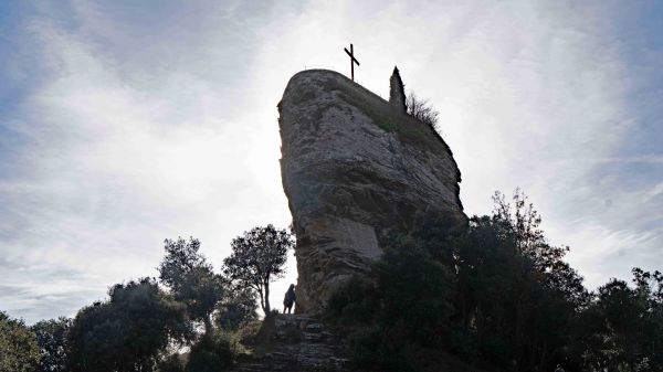 Davant nostre tenim el gran pedregot, on està el santuari i les restes de l´antic castell. A la nostra dreta, continua la carena que arriba fins les antenes i el cim del Puigsou. Agafem un camí que volta l´enorme roca, en planer; creuarem una portella, i arribem al davant del santuari.